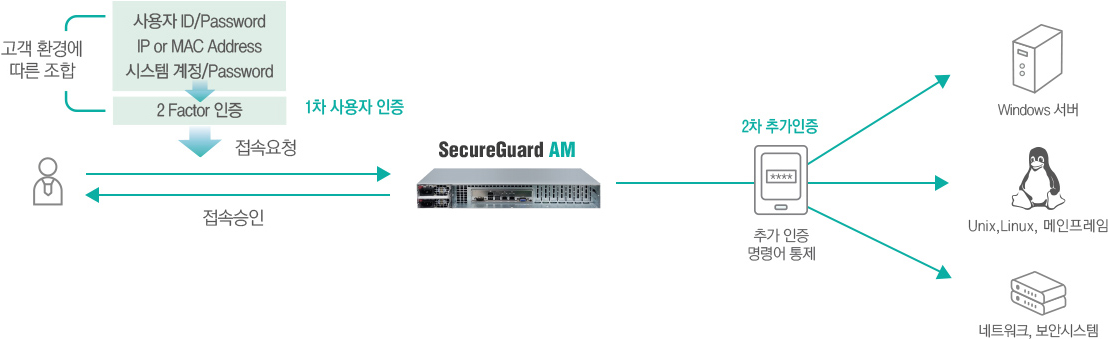 • - 시스템 접속을 위해 1차 사용자 인증(IP, MAC, OTP 등) 및 2차 추가인증(OTP)을 지원합니다.