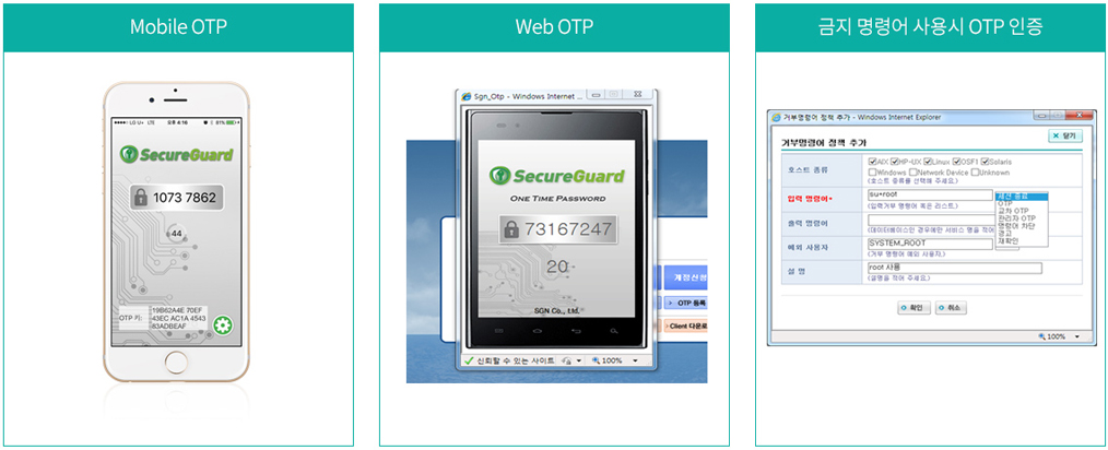 • - 명령어 통제는 사용자 별로 White list와 Black list 방식을 적용할 수 있고 위협 명령어에 대한 세션종료, 차단, 경고 뿐만 아니라 사용자 OTP 또는 사용자, 관리자 OTP를 이용한 교차 인증설정 기능을 제공합니다.