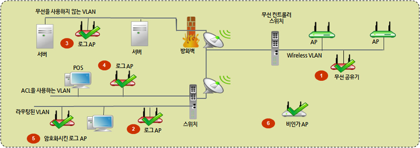 1. 암호화 된 무선 공유기 형태의 로그 디바이스 감지 / 2. 라우팅 된 VLAN에서 암호화를 사용하지 않는 AP 감지 / 3. 방화벽 적용 및 비무선 환경에서의 로그 AP 감지 / 4. ACL을 사용하는 네트워크에서의 로그 AP 감지 / 5. 라우팅 된 VLAN에서 암호화 된 로그 AP 감지 / 6. 비인가 AP(이웃 자산)과 내부 로그를 정확히 구분