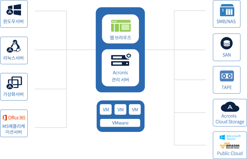 아크로니스는 업계에서 가장 폭 넓은 윈도우, 리눅스 서버 OS종류, 다양한 가상화 하이퍼바이즈 및 MS 애플리케이션 서버에 대한 백업 및 복구를 지원합니다.